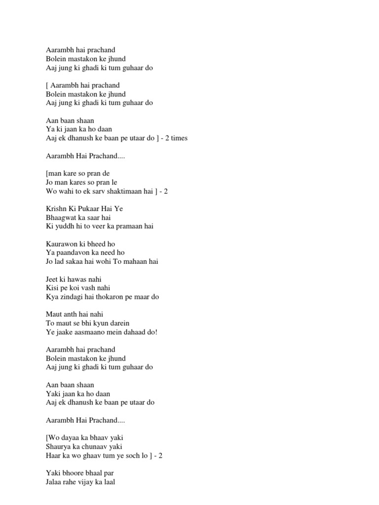 Aarambh hai prachand literally means a powerful and turbulent beginning. Veer rasa is a powerful emotion that emerges from inner strength and. I have tried translating the. The beginning is fierce, say countless heads / today you pro Aarambh hai prachand is inspired by the emotion of veer rasa—the emotion of valour, which is relatively rare in bollywood music.