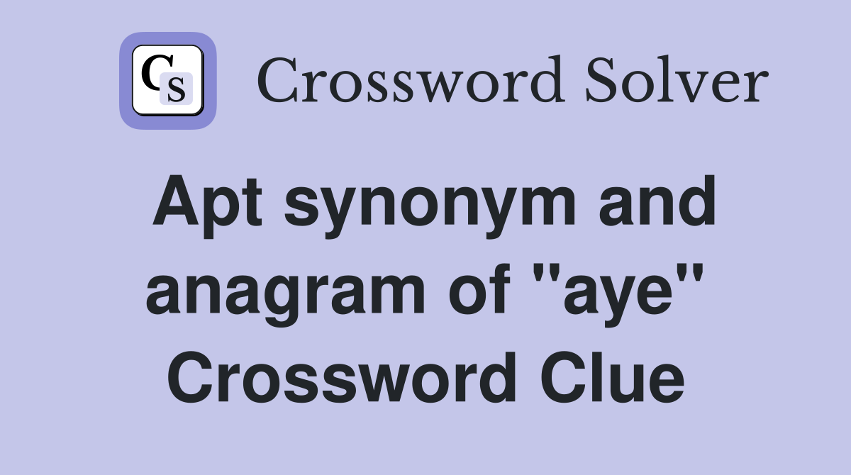 We found the following answers for: We have found 40 possible answers for this clue in our database. Now, let's get into the answer for apt synonym and anagram of aye crossword clue most recently seen in the daily themed. Yea did you find the answer for apt anagram of “aye” to go back to the main post you can.