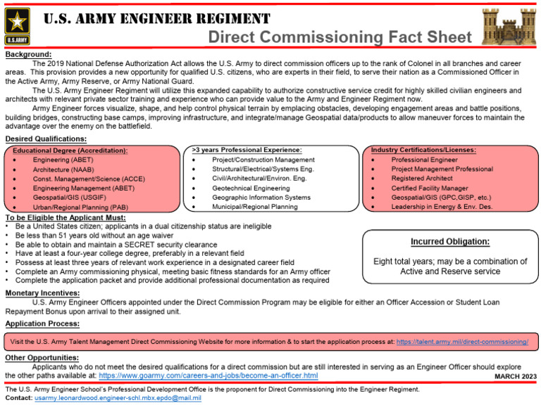 US Army Reserve Engineer Officer Direct Commissioning Fact Sheet PDF