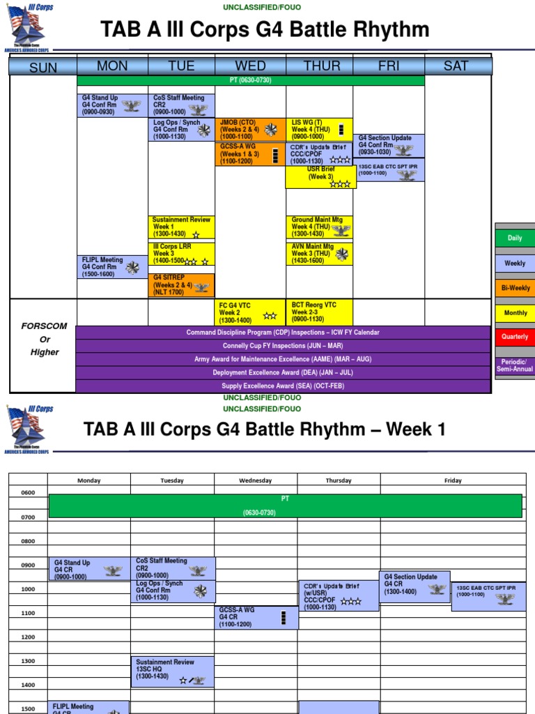 Army Battle Rhythm - This article analyzes the time management issues that units face during warfighter exercises (wfxs) and offers some. This report explores the concept of the battle rhythm, the cycle the commander and his staff use to make decisions, and how to improve the. This web page provides resources and guidance for executing command post operations and sustainment battle rhythms in the army. How can divisions adapt their staff processes to the operational tempo and the rhythm of the battle?