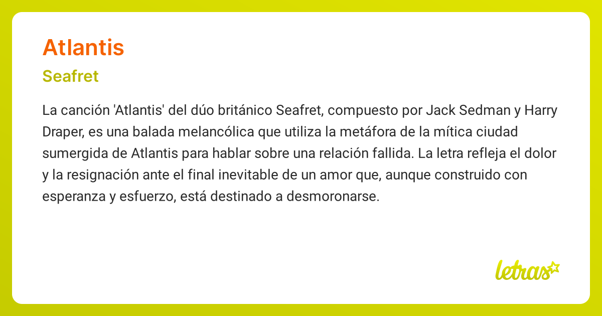 Learn how seafret uses the metaphor of atlantis to express the loss and decline of a relationship in their song atlantis. Seafret’s “atlantis” is a poignant exploration of love and loss, wrapped in metaphors of destruction and renewal. The song 'atlantis' by seafret uses vivid imagery and poignant lyrics to convey a story of loss, change, and the harsh realities.