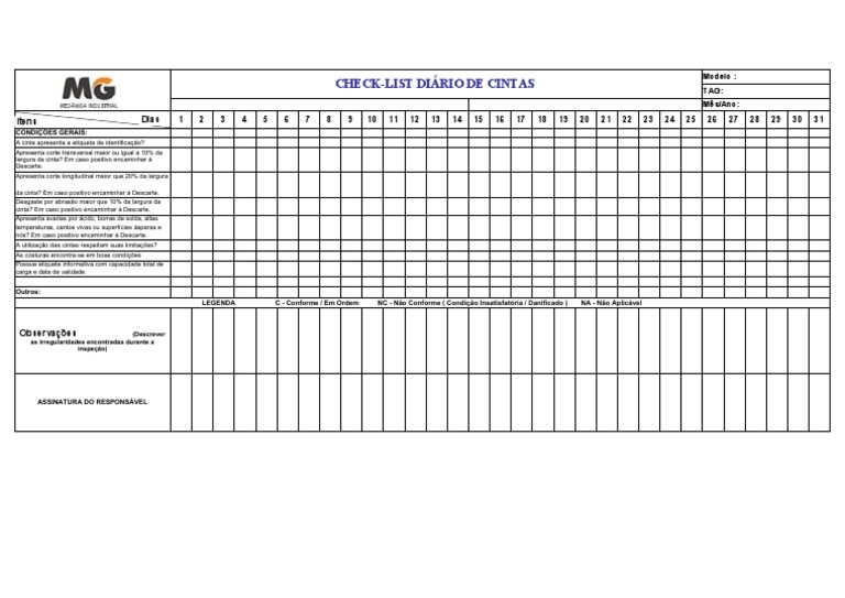 Checklist diário de inspeção de qualidade e segurança de cintas usadas
