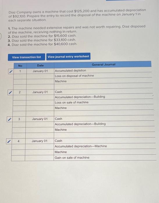 Diaz company owns a machine with a cost of $250,000 and it has a accumulated depreciation of $182,000. Diaz company owns a machine that cost $125,500 and has accumulated depreciation of $94,000. Diaz company owns a machine that costs $126,500 and has accumulated depreciation of $94,000. A company's old machine that cost $59,000 and had accumulated depreciation of $47,100 was.