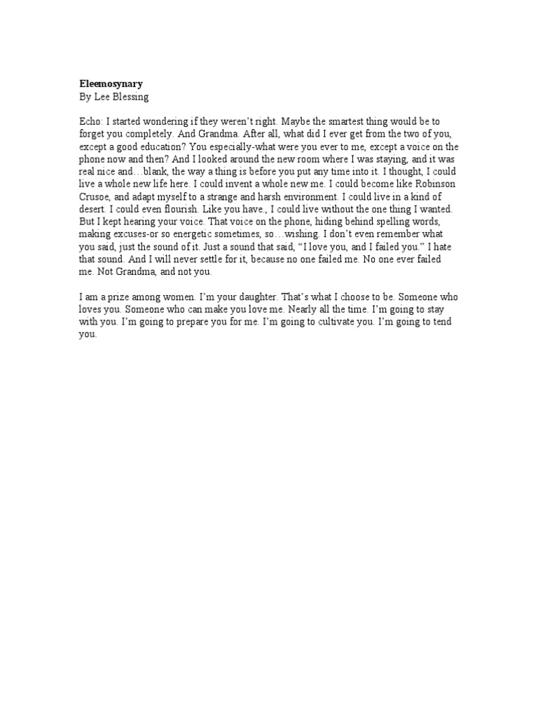 Eleemosynary, by lee blessing this play examines the delicate relationship of three women: As the play begins, echo directly addresses the audience, spelling out eleemosynary and defining it as of or pertaining to alms;. A grandmother, dorothea, who has.