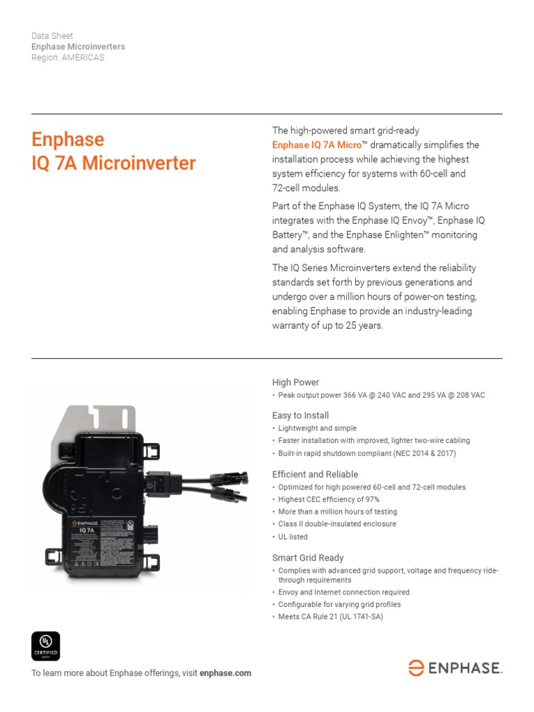 Enphase iq 7 micro™ and enphase iq 7+ micro™ dramatically simplify the installation process while achieving the highest system efficiency. Part of the enphase energy system, the iq7 and iq7+ microinverters integrates with the iq gateway, iq battery, and the enphase installer app monitoring. Enphase iq7/iq7+ microinverter data sheet review specifications for the enphase iq7/iq7+ microinverters Enphase iq series™ microinverters.