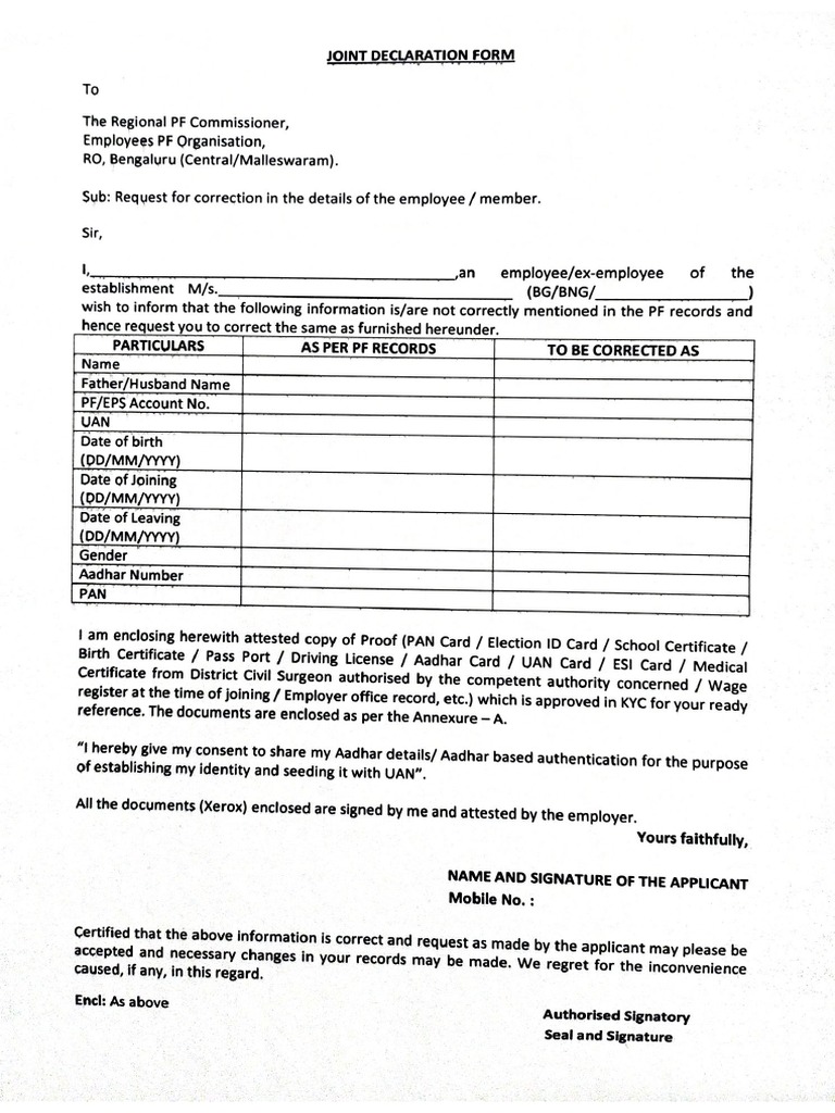 If there are changes with regards to name,. To the regional p f commissioner _____ sub: Joint declaration by the member and the employer. Here you can download and used for correction in the pf. To the regional pf commissioner,.………………………………………….