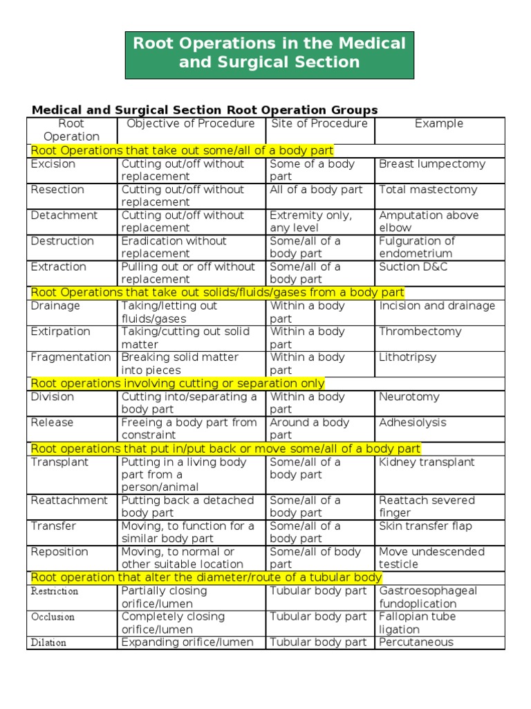 The purpose of the root operation is to reflect the objective of the. Root operation descriptions present the full definition of root operations in the medical and surgical section, including explanation and. Manual exploration may be performed directly or through intervening body layers. Manual procedure that involves a directed. Character three in the pcs coding system reflects the root operation.