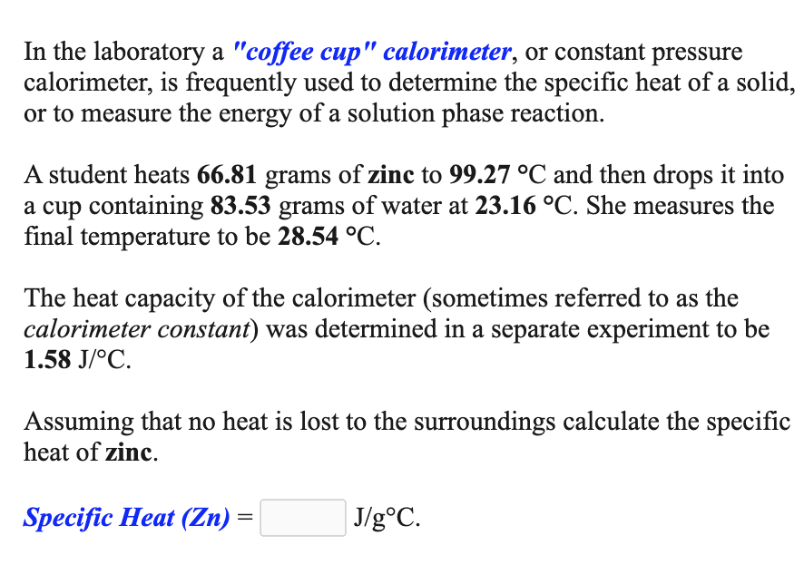 A coffee cup calorimeter is an instrument used in thermodynamic chemistry to measure the heat of a chemical reaction. A coffee cup calorimeter measures the δh (change in enthalpy) for aqueous solutions or reactions. It is called a coffee cup calorimeter because it resembles a regular. A coffee cup calorimeter is a simple yet effective device used to measure the.