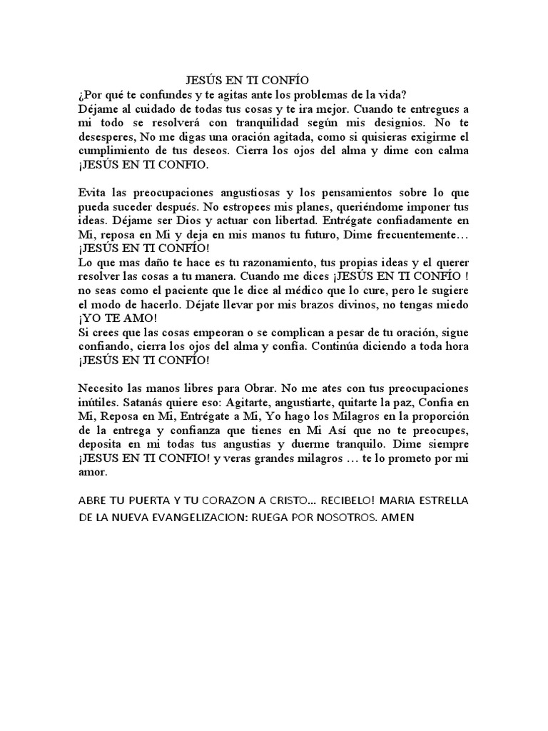 Jesus, i trust in you is the translation of jesús, en ti confío into english. La frase jesús en ti confío es una oración que ha ganado popularidad en el catolicismo y se ha convertido en un mantra para muchos. En este artículo, vamos a sumergirnos en la oración completa jesús en ti confío, descubriendo su significado profundo y el..