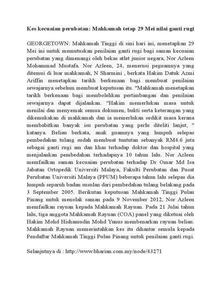 Kes Kecuaian Perubatan Di Malaysia - Kajian ini akan mengupas dengan lanjut mengenai kecuaian yang dilakukan oleh pengamal perubatan sama ada di sektor awam mahupun swasta. Kerajaan didapati bertanggungjawab ke atas saman kecuaian berkaitan proses berkhatan 12 tahun lalu kerana doktor di dua hospital kerajaan lambat memberi rawatan kepada.