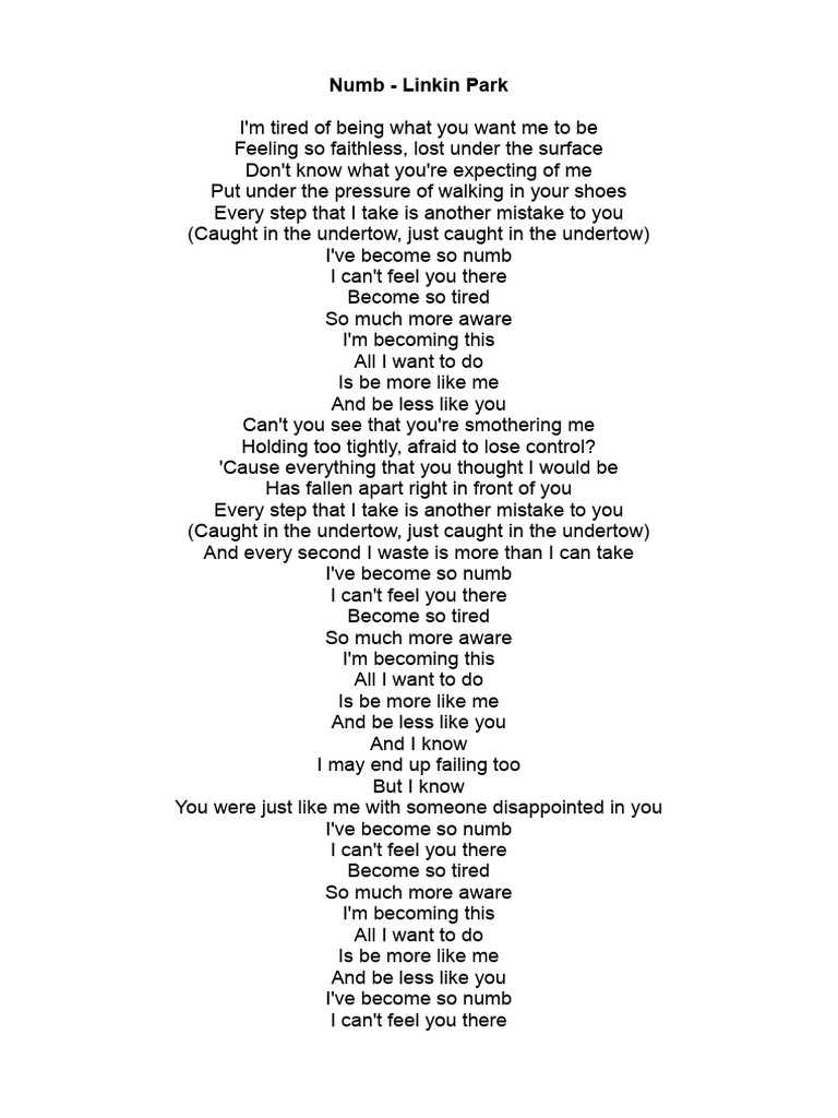 I'm tired of being what you want me to be / feeling so faithless, lost under the surface / don't know what you're. Numb by linkin park song meaning, lyric interpretation, video and chart position In the video for “numb,” which was shot in prague, a young female artist is bullied and alienated in her high school.