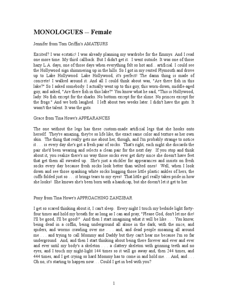 10 contemporary play monologues with young female characters helps performers find new monologues from plays for drama. Lawrence harbison has selected 100 terrific monologues for women from contemporary plays, all by characters between the ages of 18 and.