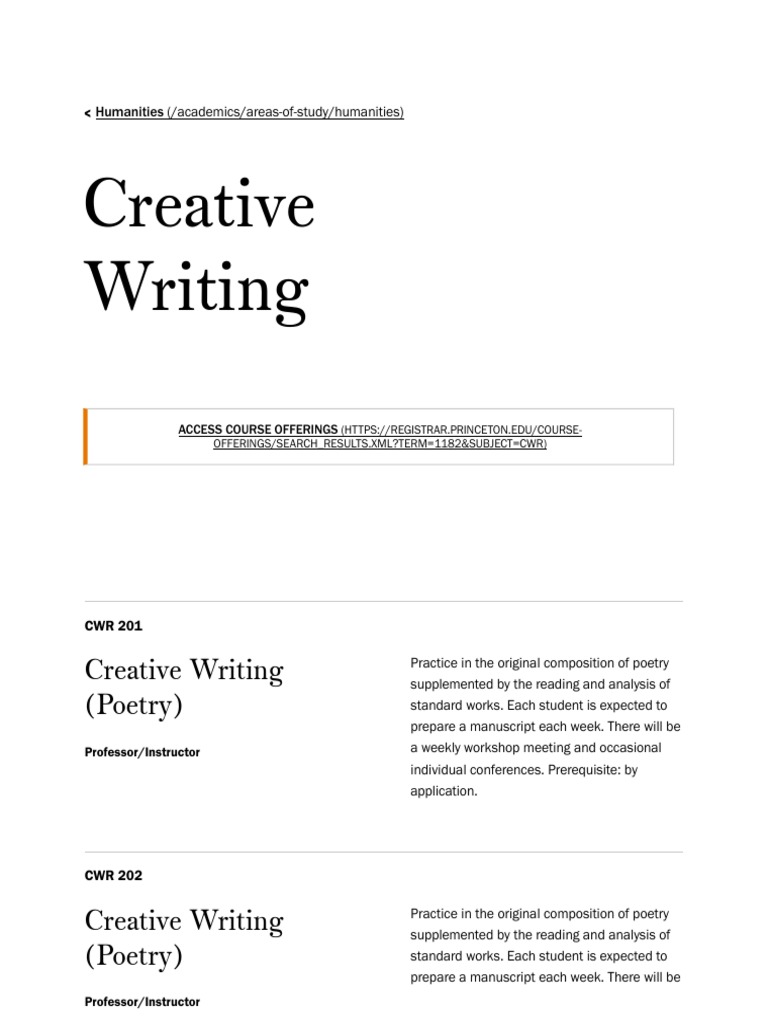 Minors in creative writing will encounter a rigorous framework of courses. These courses are designed, first and foremost, to teach the. Through writing prompts, exercises, study and reflection, students will be guided in the creation of original dramatic material. The program allows undergraduates to work with practicing writers to develop their writing skills, learn the possibilities of modern poetry, fiction,. Program in creative writing / 6 new south. Tutorials in the original composition of fiction, poetry, or translations, open to those who have demonstrated unusual commitment and talent. If you've excelled in architecture, creative writing, dance, music, music theater, theater or visual arts, and would like us to consider your talent as part. The program in creative writing offers princeton undergraduates the opportunity to craft original work under the guidance of some of today’s.
