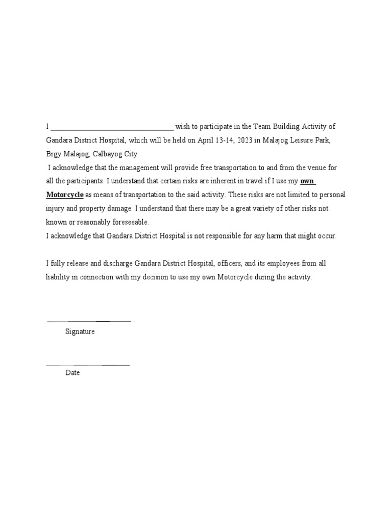 A waiver form for a motorcycle ride is a legal document that aims to protect the organizers, sponsors, and owners of the motorcycle from any.