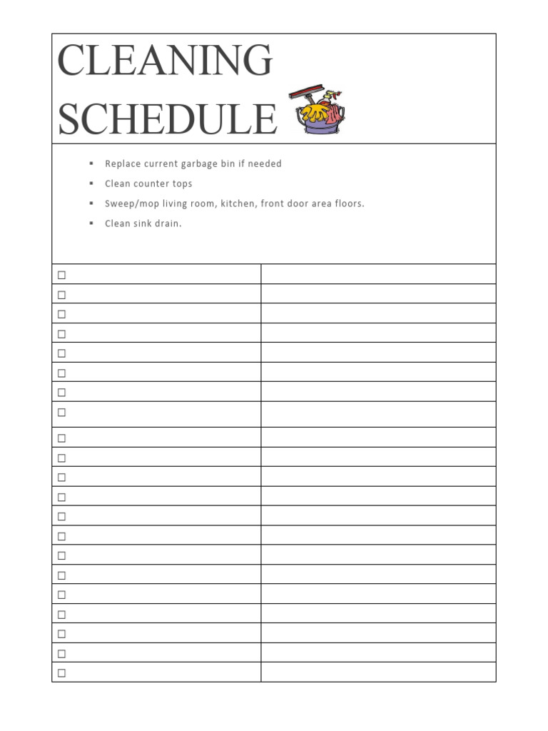 Free printable cleaning schedules and checklists to help you plan when cleaning duties are performed. If you have more flexibility in your schedule you may. Includes daily, weekly, and monthly lists, and blank versions,. This weekly house cleaning schedule is meant to work for you, not against you.