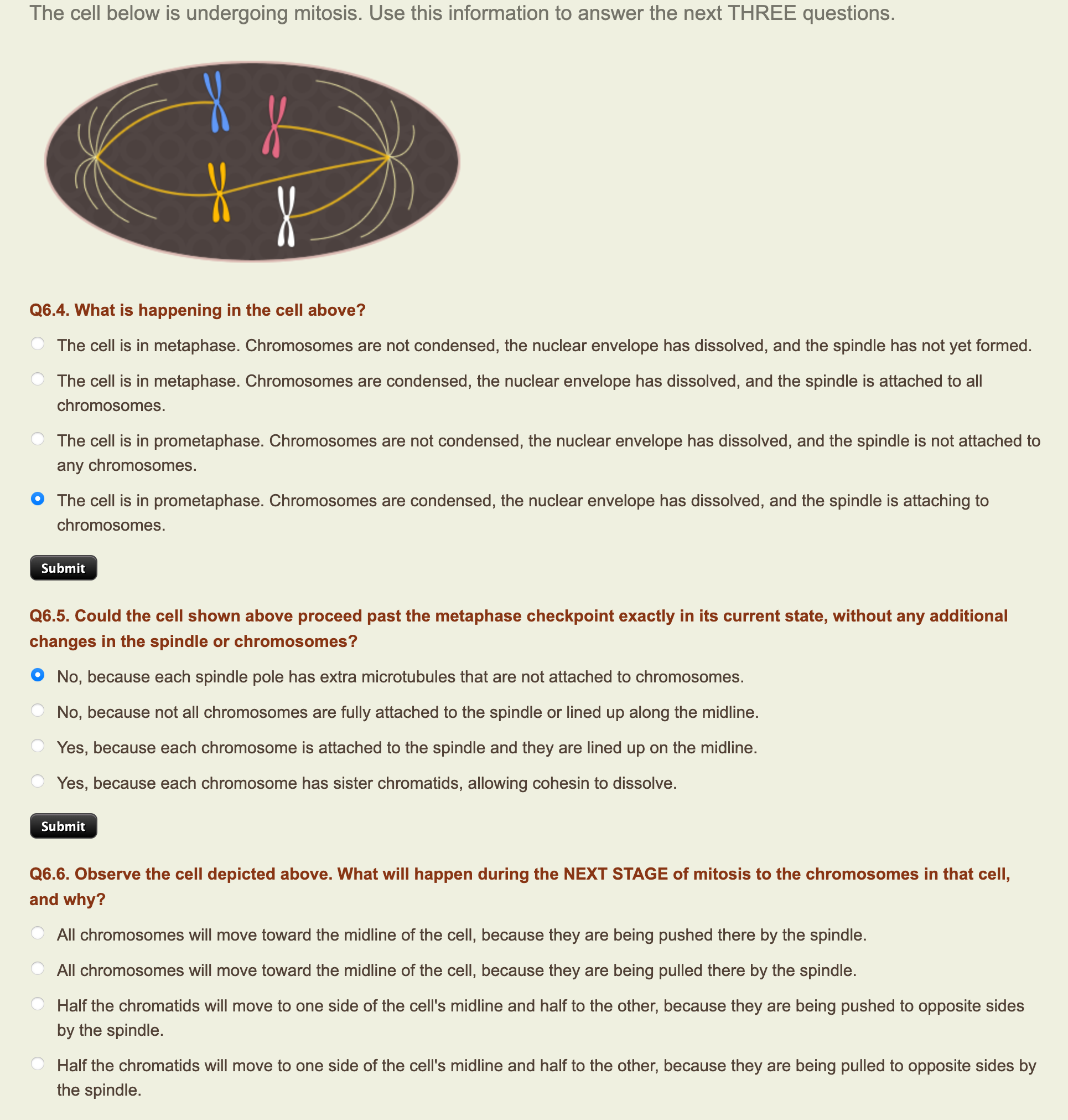Q6 4 What Is Happening In The Cell Above - Chromosomes are not condensed, the nuclear envelope has dissolved, and the spindle. The cell is in metaphase. The nuclear membrane disintegrates, the chromosomes condense, and. What is happening in the cell above? Each daughter cell receives half of each. Chromosomes are condensed, the nuclear envelope has dissolved, and the spindle is attached to all. The cell is in metaphase. How are the four replicated chromosomes in the parent cell shared between the two daughter cells? The cell is in metaphase. Chromosomes are not condensed, the nuclear envelope has.