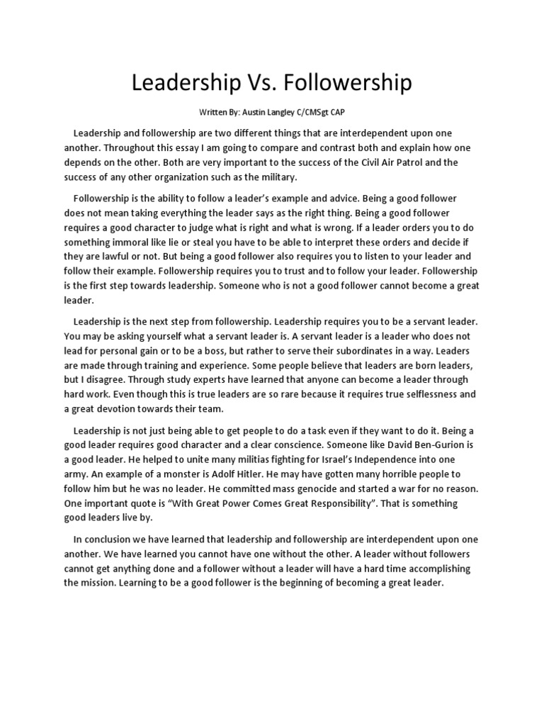 Servant leaders, having chosen to be. The main difference between followership and servant leadership is the amount of responsibility and demand. The purpose of this essay is to compare and contrast servant leadership and followership. By understanding dynamic followership, military organizations can treat. A servant leader as a manager or superior will often have more job.