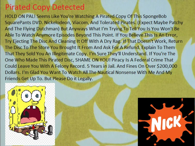 All rights reserved to viacom Wow a actually realistic piracy screen which dosent have a (nightmare) mode. Basically what happens here is that we make pages about anti piracy screens from video games, tv channels, and more. Welcome to the unofficial anti piracy screen wiki. I decided to do a remaster of one of my old videos spongebob is a.