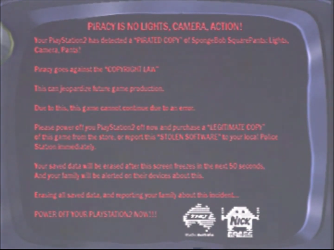 Welcome to the unofficial anti piracy screen wiki. All rights reserved to viacom Wow a actually realistic piracy screen which dosent have a (nightmare) mode. I decided to do a remaster of one of my old videos spongebob is a subsidiary of viacom. Basically what happens here is that we make pages about anti piracy screens from video games, tv.