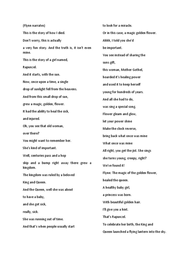 A transcript of the animated film tangled, featuring the narration of flynn rider and the songs of rapunzel and mother gothel. Read the full script of the animated film tangled, featuring flynn narrating the story of rapunzel and her quest to find her birth mother. And from this small drop of sun,grew a magic, golden, flower. Rapunzel pleads with gothel to save eugene life. Now, once upon a time, a singledrop of sunlight fell from the heavens.
