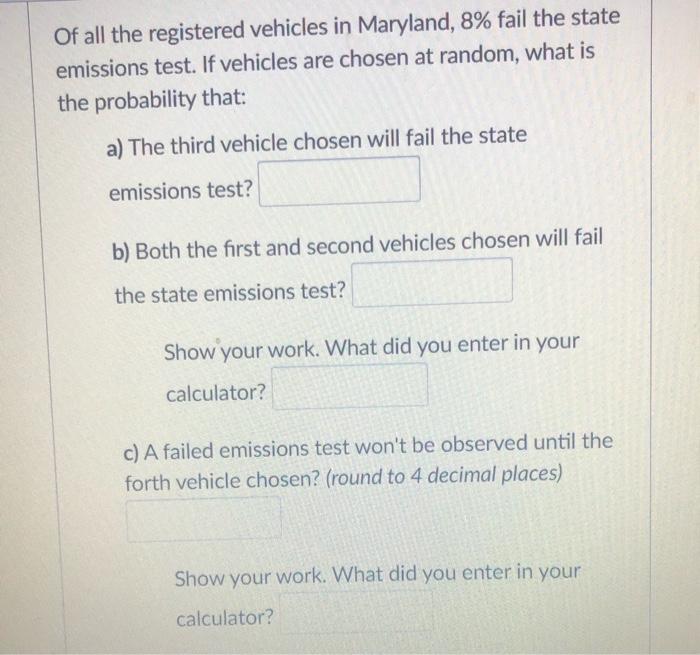 Solved Of all the registered vehicles in Maryland, 8 fail