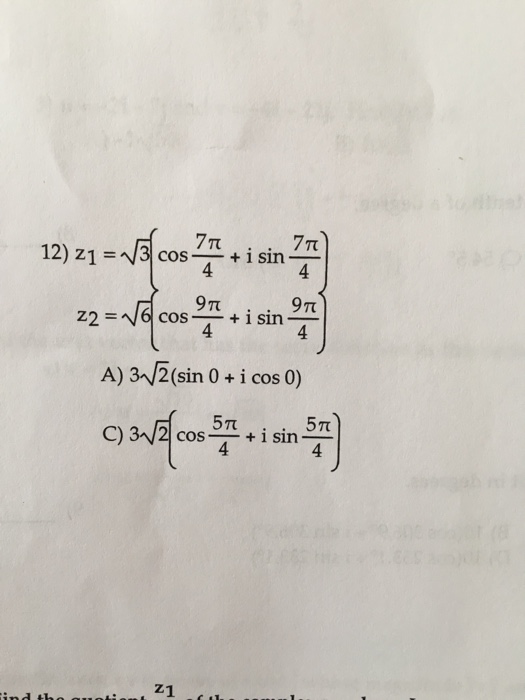 Solved Z_1 = Squareroot 3 {cos 7pi/4 + i sin 7pi/4} z_2 =