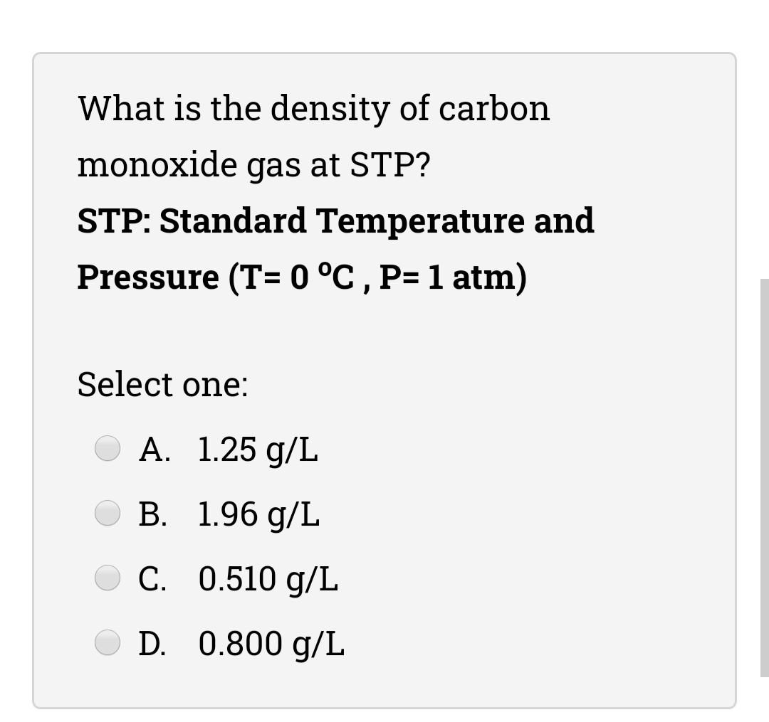 Solved What is the density of carbon monoxide gas at STP?