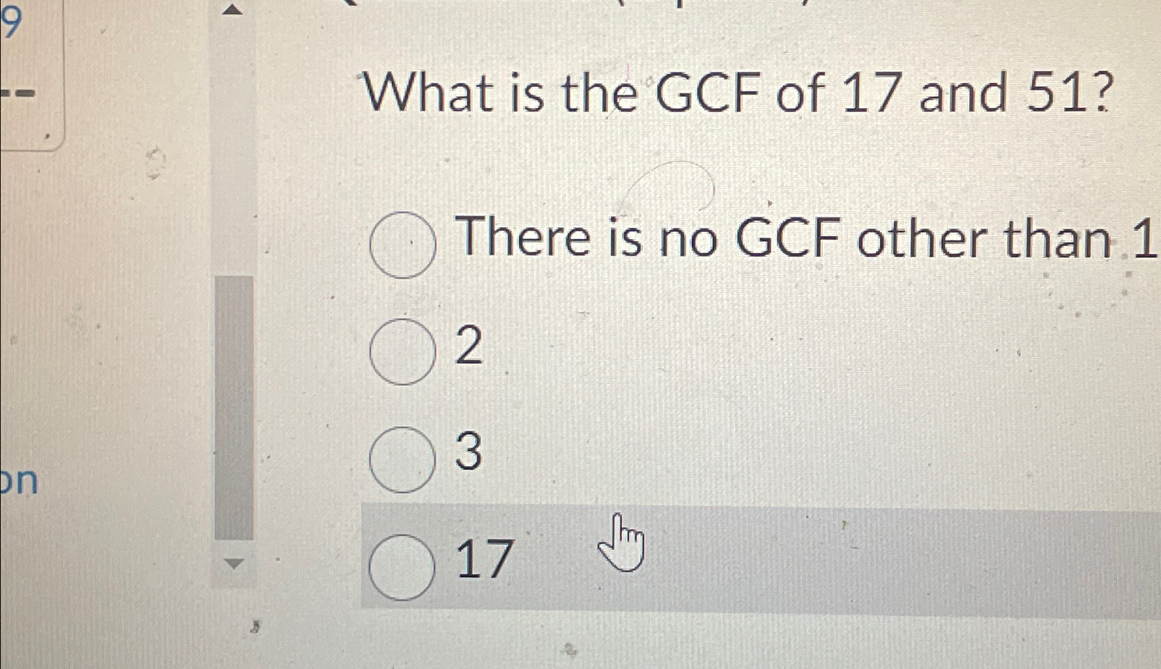 Solved What is the GCF of 17 and 51?There is no GCF other