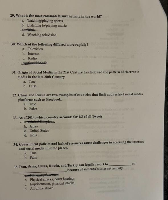 29. What is the most common leisure activity in the