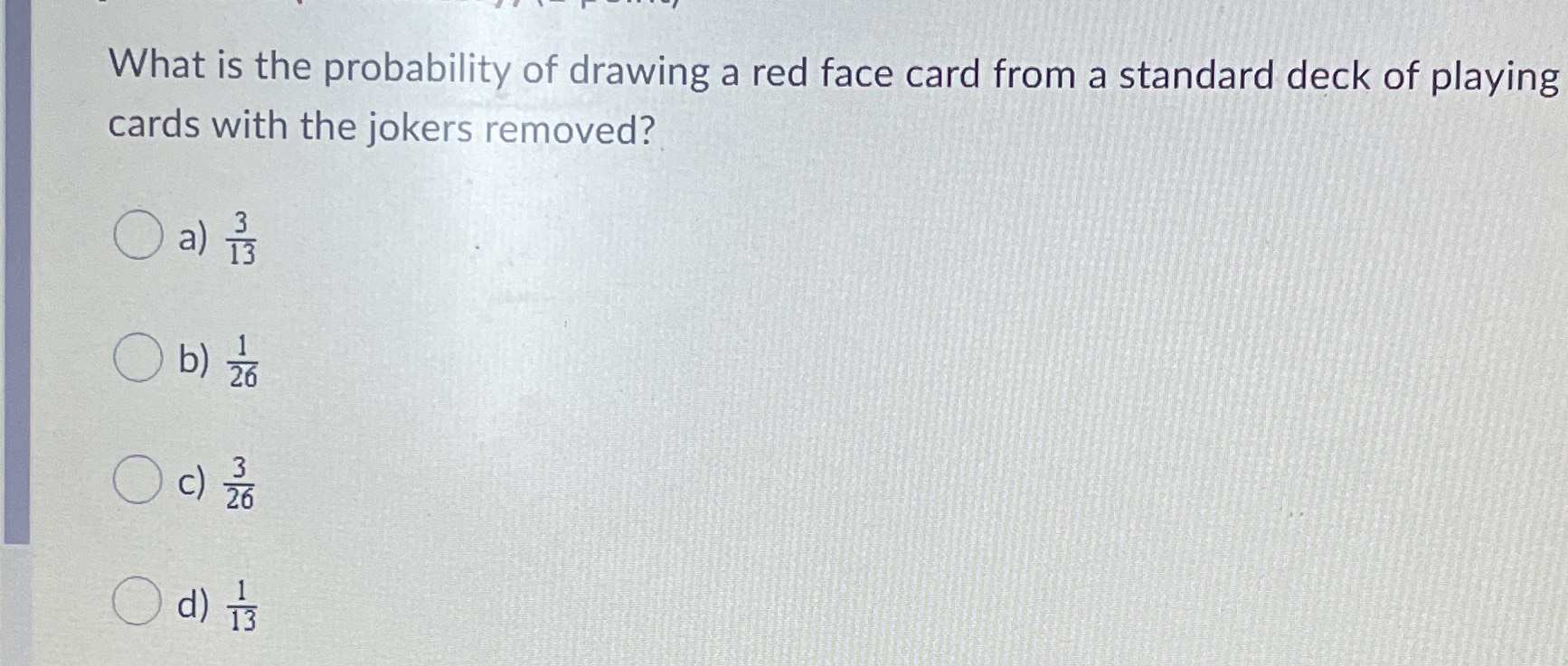If a card is selected from a deck of 52 cards, then the probability of its being a red face card is (a) 3 26 (b) 3 13 (c) 2 13 (d) 1 2 Probability of either a face card or a heart, add individual probabilities, but remember to subtract the three heart face cards, to not count them. There.