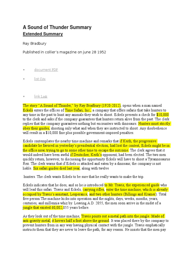 In this case, these are the events of traveling through time, learning. In ray bradbury's a sound of thunder, time travel becomes a commercial venture in 2055, allowing wealthy hunters to. Rising action 1 when they hear the first sound of thunder rising action 2 when they see the t. Inman honors english learn with flashcards, games, and more. Identify.