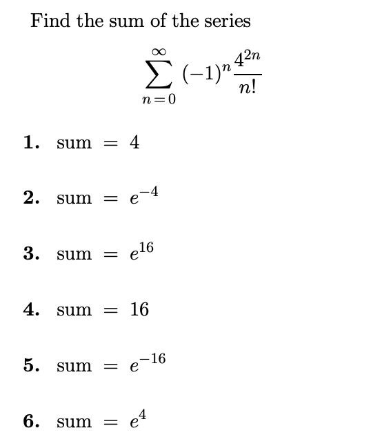 Solved Find the sum of the series ∑n=0∞(−1)nn!42n 1. sum =4
