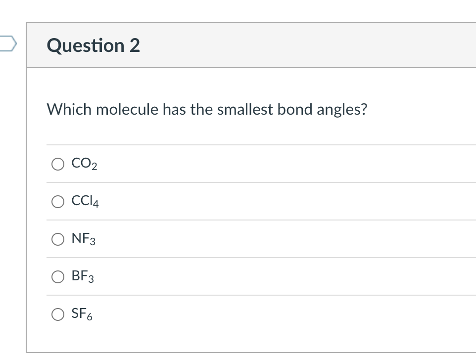Solved Which molecule has the smallest bond angles? CO2 CCl4