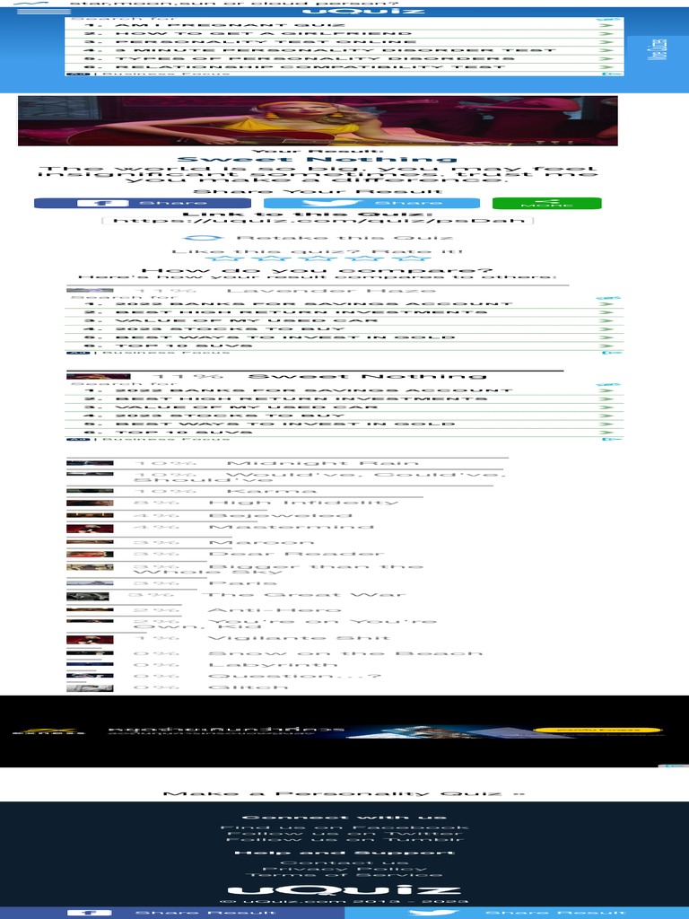 Uquiz.com is a free online quiz making tool. Generate leads, increase sales and drive traffic to your blog or website. Make quizzes, send them viral. Answer specific questions and i’ll kin assign you to one of my favorite depression songs :) Uquiz.com is a free online quiz making tool. Generate leads, increase sales and drive traffic to your blog or website. Which song from taylor swift's 'midnights' are you? Make quizzes, send them viral. Pick a random taylor swift lyric that you relate to. Which midnights song are you?