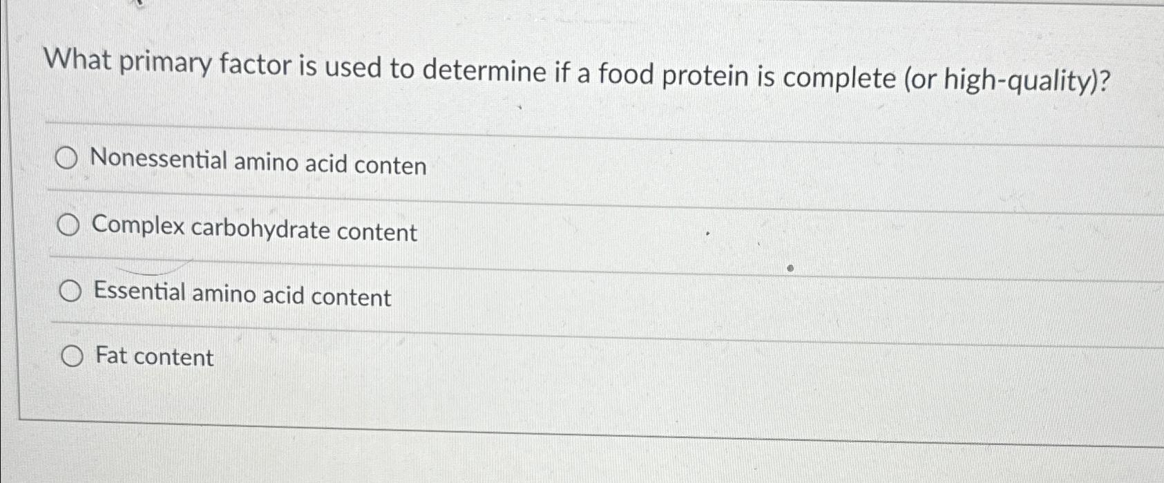 The **amino acid composition** governs the quality of a food protein because it determines the protein’s ability to meet the. Essential amino acid content c. The answer lies within its essential amino acid profile. What primary factor governs the quality of a food protein? **the primary factor that governs the quality of a food protein is its amino acid profile.**.