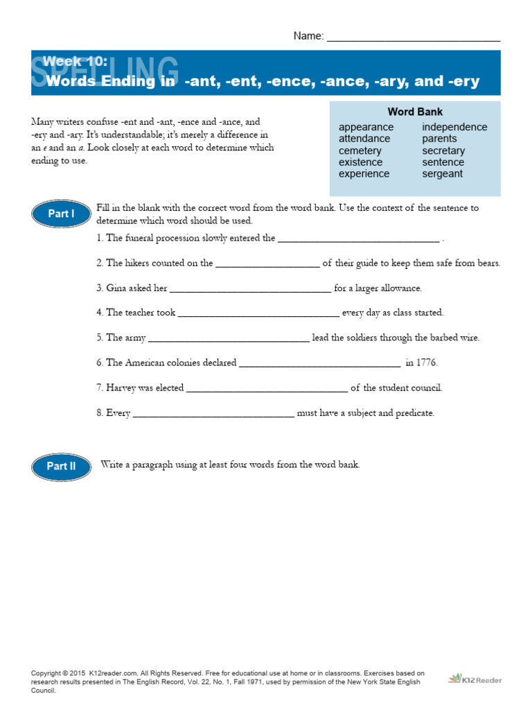 WK 10 Words Ending in Ant Ent Ence Ance Ary Ery PDF
