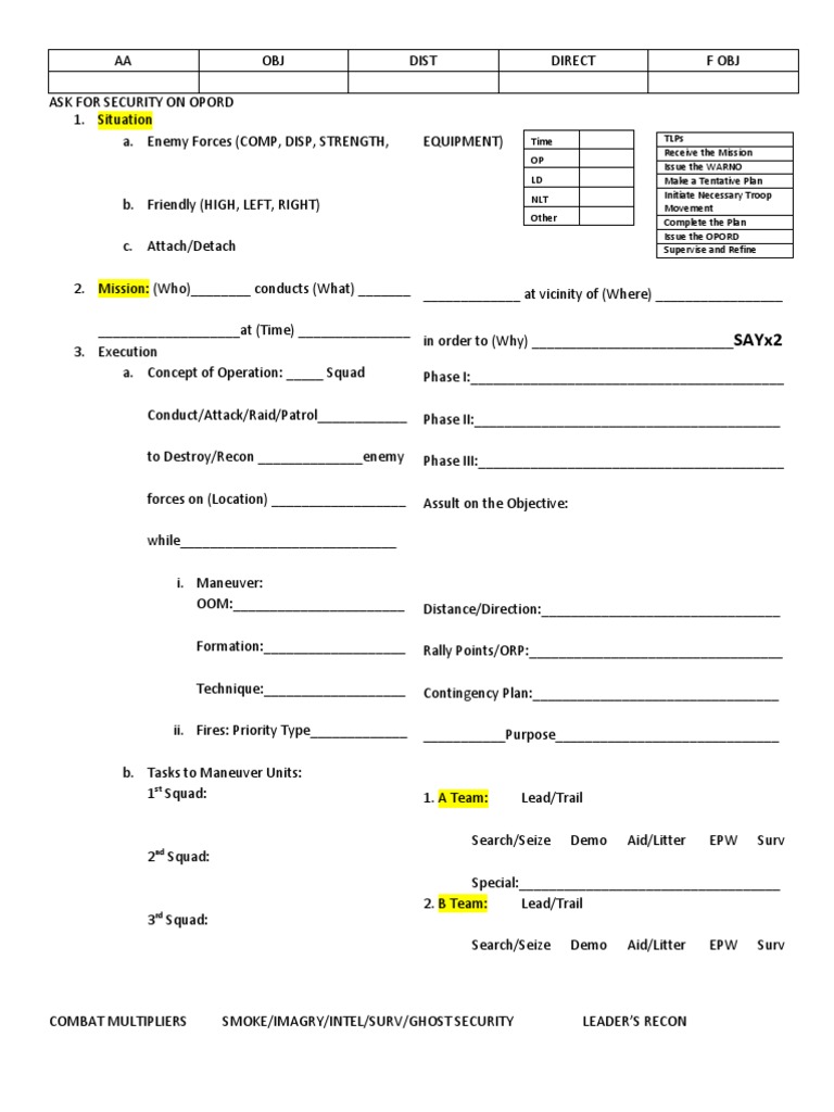 This file contains a comprehensive operations order (opord) template. The operations order template the following opord template was created for use at the maneuver captain’s career course (mccc). Platoon opord template 2 terrain analysis (oakoc) obstacles: Operations order template for military use.