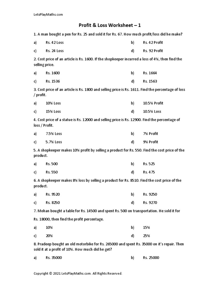Worksheet On Profit And Loss